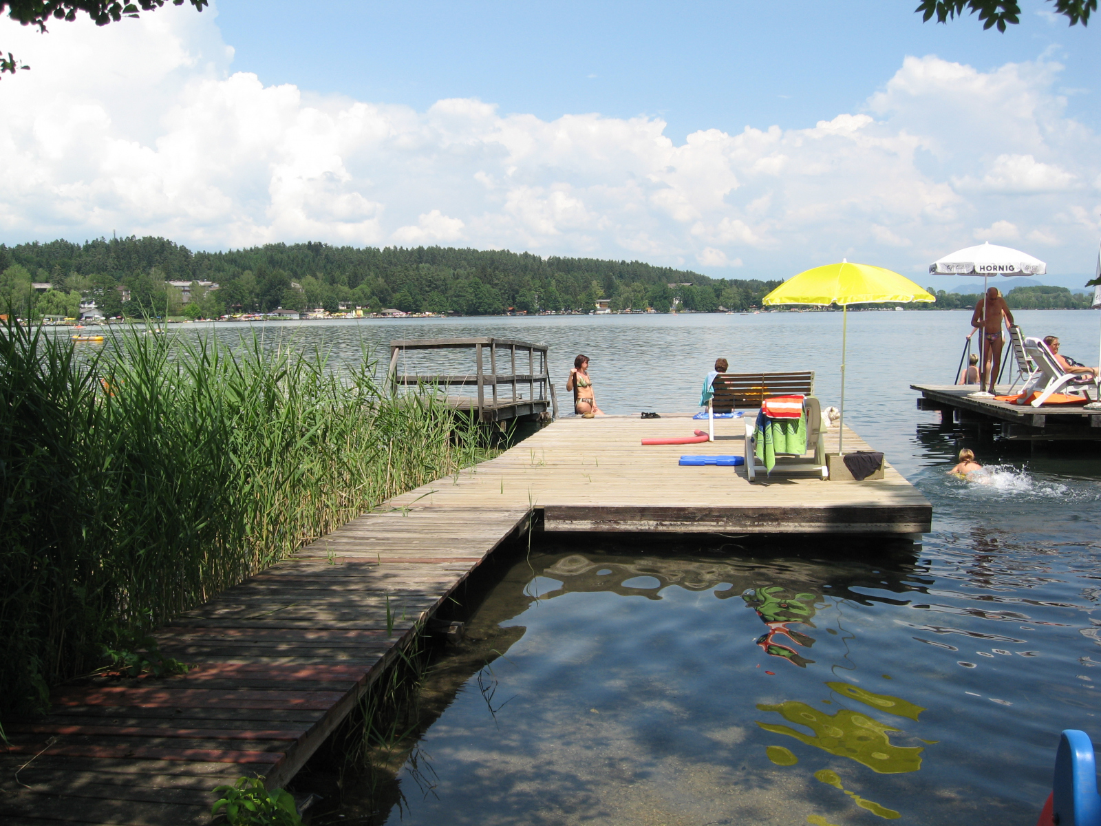 Der Badestrand besteht aus einer Liegewiese sowie einen Badesteg mit 15 Liegestühlen und 20 Sonnenschirmen.