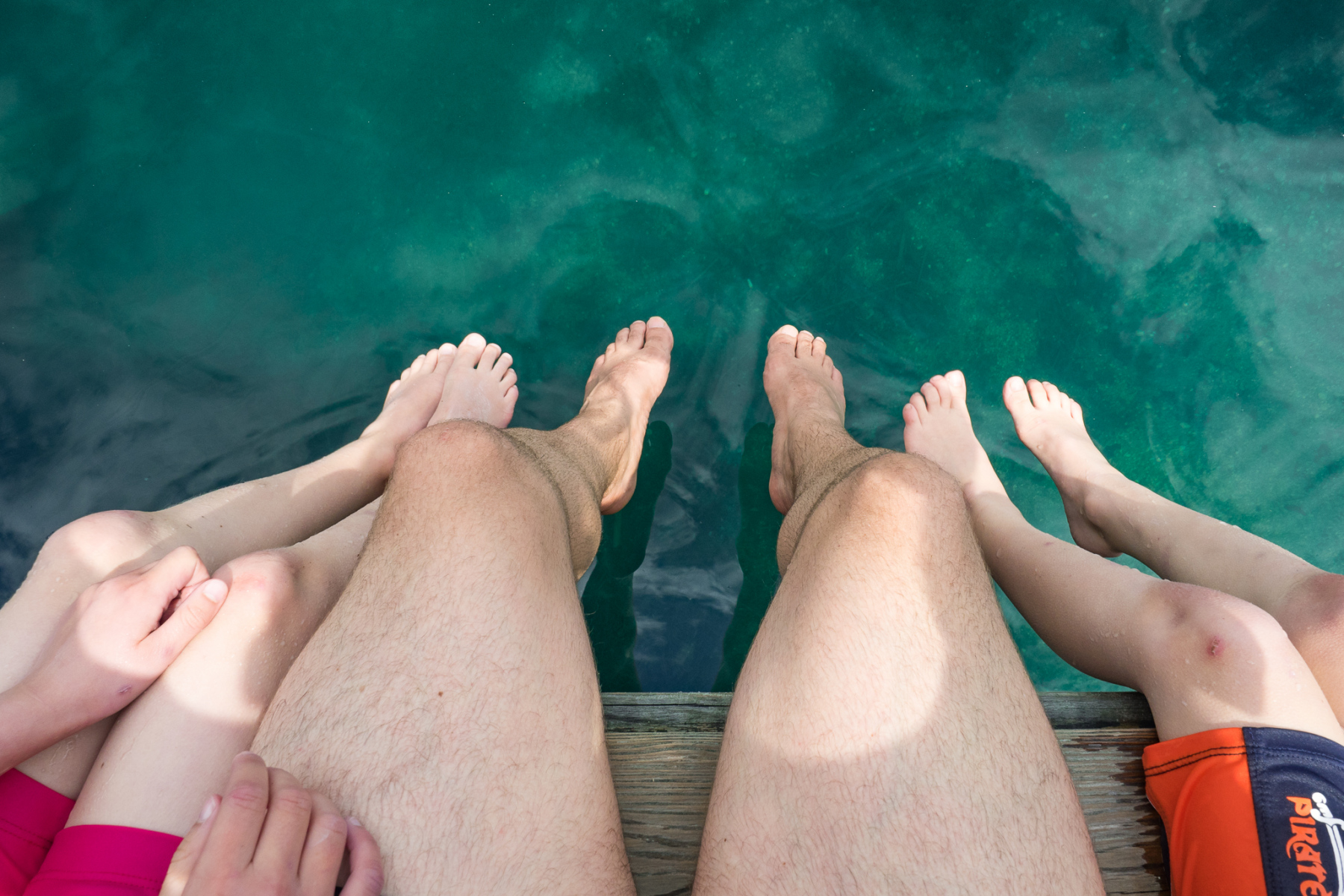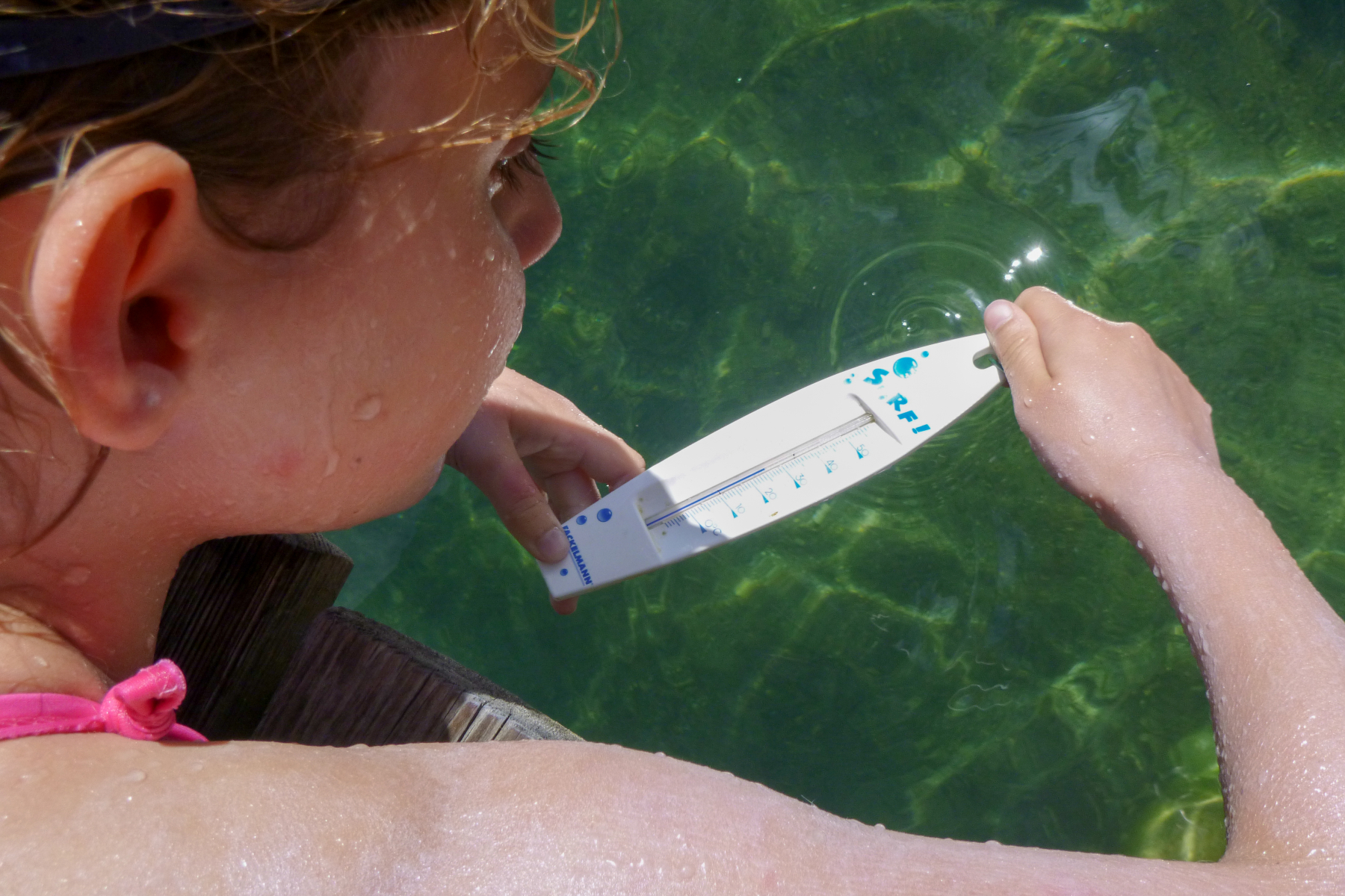 Am Ufer beträgt die Wassertiefe ca. 0,4m und am Ende vom Steg 2,5m.