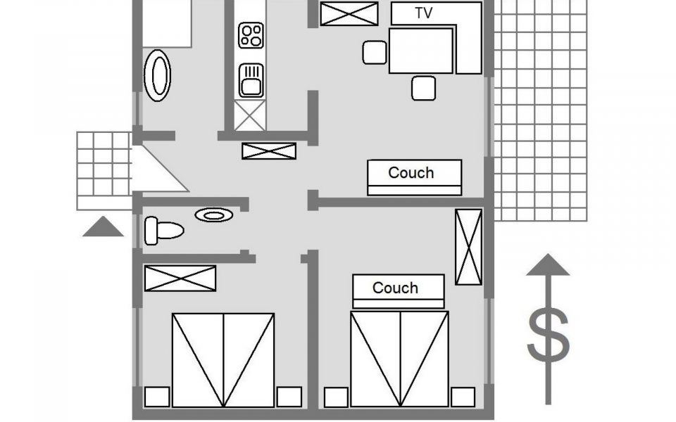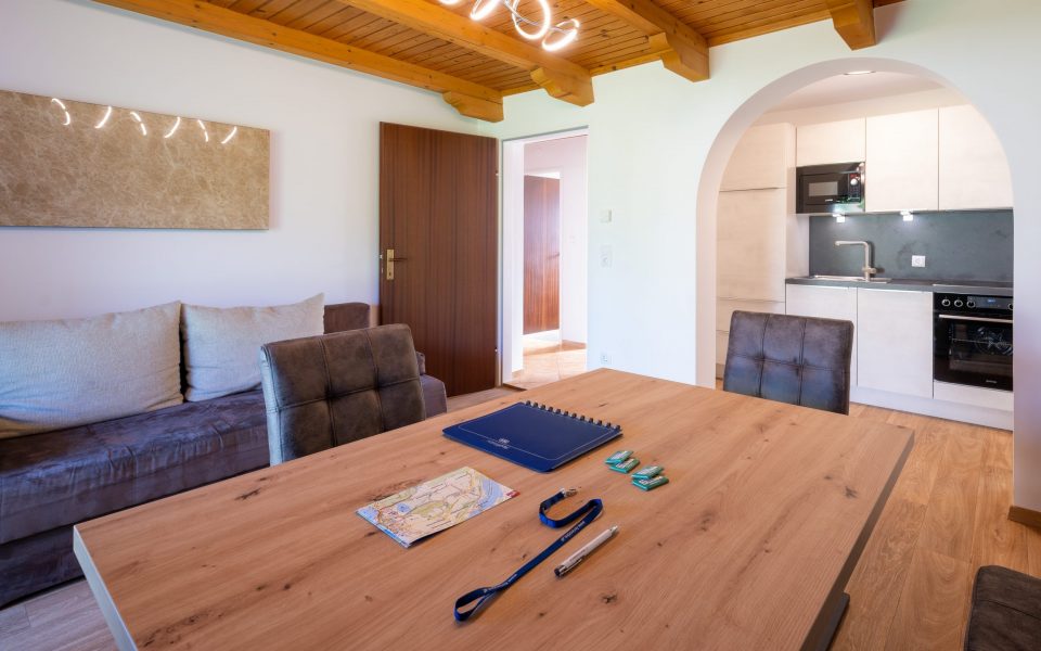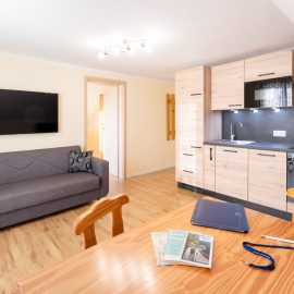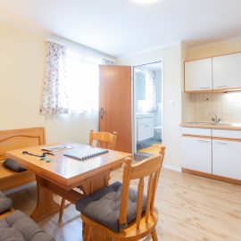 Es besteht aus zwei Doppelzimmern, Vorraum, Bad mit Föhn, separatem WC, Wohnküche, 9m² Terrasse und einem Autounterstellplatz.