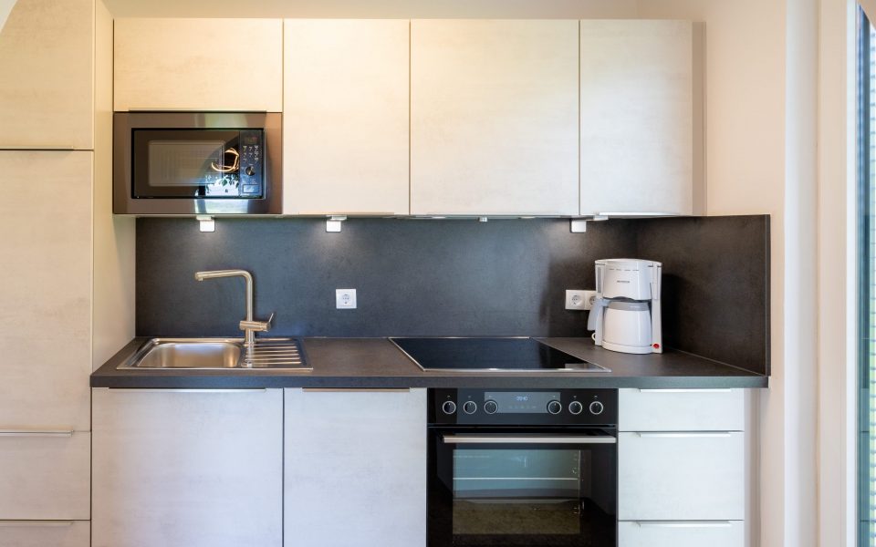 In der Wohnküche finden Sie eine Sitzecke, Ausziehcouch, Flat-TV und eine komplett ausgestattete Küche mit Geschirrspüler, Mikrowelle, Backofen, Herd, Kühlschrank, Besteck, Geschirr und einer Kaffeekapselmaschine von Cafissimo.