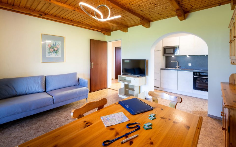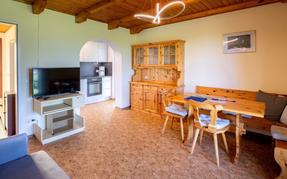 In der Wohnküche finden Sie eine Sitzecke, Ausziehcouch, Flat.-TV und eine neue komplett ausgestattete Küche mit Geschirrspüler, Backofen, Herd, Kühlschrank, Mikrowelle, Besteck, Geschirr und einer Filterkaffeemaschine.