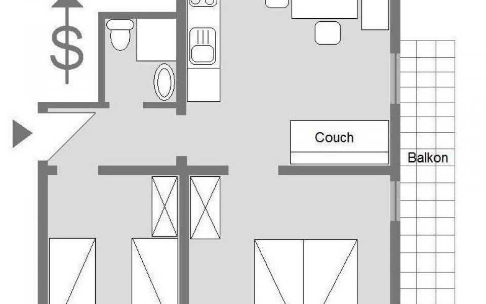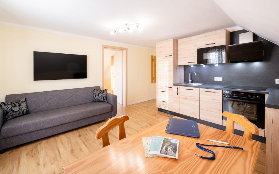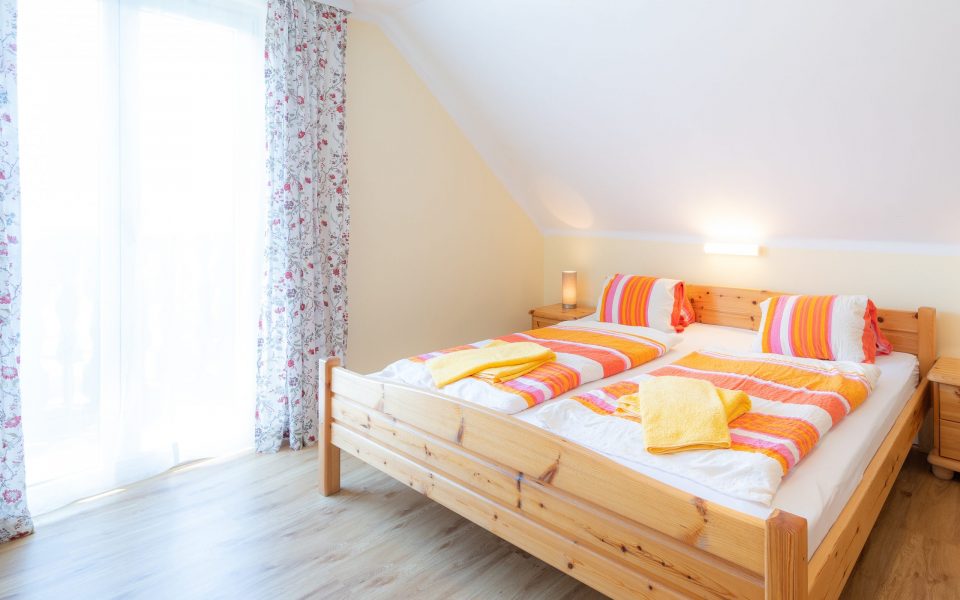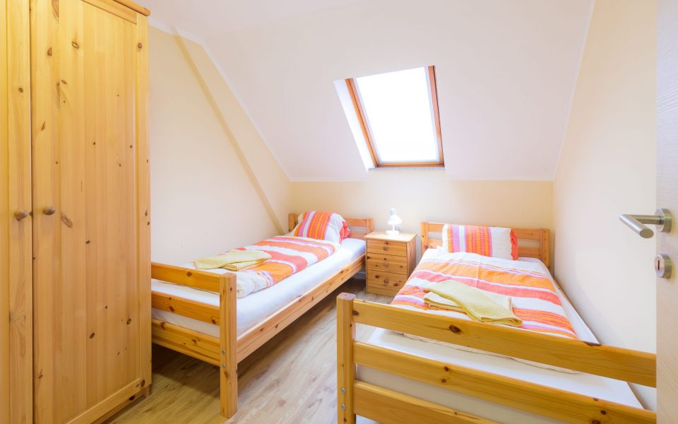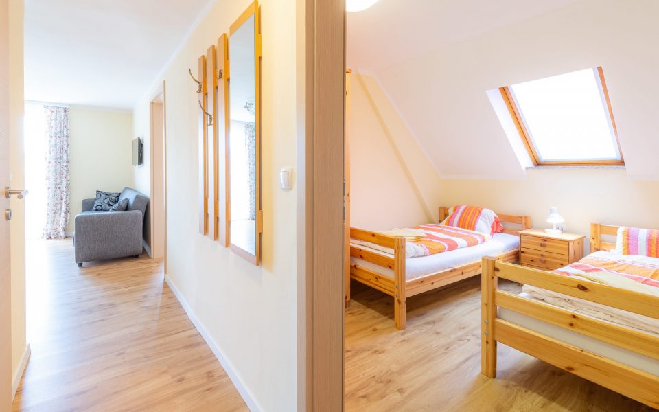 Sie befindet sich im zweiten Stockwerk und verfügt über ein Doppelzimmer, ein Zimmer mit 2 getrennten Betten, neues Bad mit Föhn, Vorzimmer, Wohnküche, kleinen Balkon und einem Autounterstellplatz.